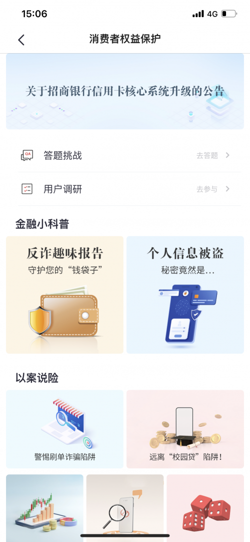 掌上生活App消保專區(qū),推動(dòng)消保宣教數(shù)字化 結(jié)合現(xiàn)階段防疫抗疫各項(xiàng)要求,招行信用卡圍繞“普及金融知識(shí),優(yōu)化金融服務(wù),助力疫情防控”的活動(dòng)口號(hào),充分發(fā)揮旗下掌上生活A(yù)pp平臺(tái)優(yōu)勢(shì),持續(xù)構(gòu)建消保宣教數(shù)字化常態(tài)陣地。掌上生活A(yù)pp月活躍用戶數(shù)超4500萬,居同業(yè)信用卡類App前列,是推動(dòng)消保宣教數(shù)字化落地的有力抓手。今年起,掌上生活A(yù)pp打造消保專區(qū),集消保宣教、用戶調(diào)研、用戶反饋等多個(gè)版塊,讓用戶知曉更多的詐騙套路,從知識(shí)宣傳和用戶調(diào)研、意見反饋多維度出發(fā),深度落實(shí)金融知識(shí)普及等消保工作。 在具體措施方面,掌上生活消保專區(qū)開設(shè)了“金融小科普”“以案說險(xiǎn)”等欄目,以通俗易懂的科普方式傳播金融知識(shí),幫助金融消費(fèi)者建立、鞏固健康的金融理念,號(hào)召正確認(rèn)識(shí)、使用金融產(chǎn)品,規(guī)避非法金融活動(dòng)和騙局風(fēng)險(xiǎn)。在用戶調(diào)研方面,通過在線調(diào)研問卷形式,主動(dòng)收集消費(fèi)者問題和建議,積累真實(shí)聲音;在用戶反饋上,布局在線智能服務(wù),以及時(shí)響應(yīng)消費(fèi)者疑問和需求。找到該專區(qū)很簡(jiǎn)單,只要打開掌上生活A(yù)pp首頁,再點(diǎn)擊“我的”即可。