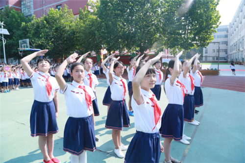 操場上,鮮艷的五星紅旗徐徐升起。該校全體師生著裝整齊,為新學(xué)期的到來時(shí)刻準(zhǔn)備著。
