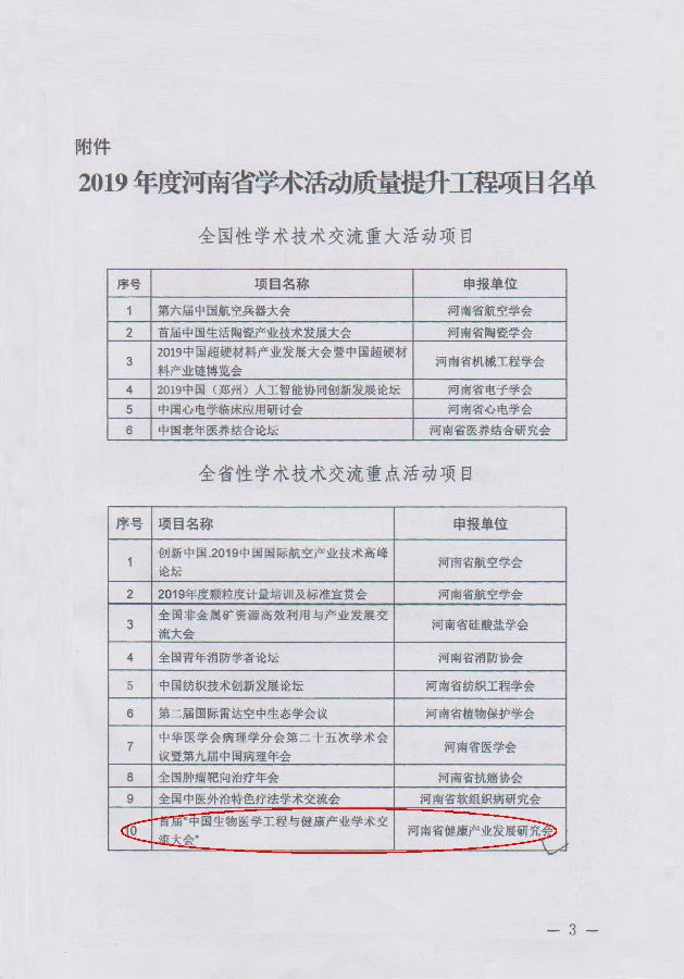 中報(bào)網(wǎng)河南訊 由河南省科學(xué)技術(shù)協(xié)會(huì)批準(zhǔn)河南省健康產(chǎn)業(yè)發(fā)展研究會(huì)、河南省生物醫(yī)學(xué)工程學(xué)會(huì)承辦的首屆“中國(guó)生物醫(yī)學(xué)工程與健康產(chǎn)業(yè)學(xué)術(shù)交流大會(huì)”日前拉開(kāi)序幕。 2019年1月10日,河南省科學(xué)技術(shù)協(xié)會(huì)《關(guān)于公布2019年度學(xué)術(shù)活動(dòng)質(zhì)量提升工程項(xiàng)目的通知》豫科協(xié)發(fā)〔2019〕1號(hào)文件,向全省各省轄市科協(xié),全省學(xué)會(huì)、協(xié)會(huì)、研究會(huì)發(fā)出通知,批準(zhǔn)河南省健康產(chǎn)業(yè)發(fā)展研究會(huì)、河南省生物醫(yī)學(xué)工程學(xué)會(huì)承辦首屆“中國(guó)生物醫(yī)學(xué)工程與健康產(chǎn)業(yè)學(xué)術(shù)交流大會(huì)”。