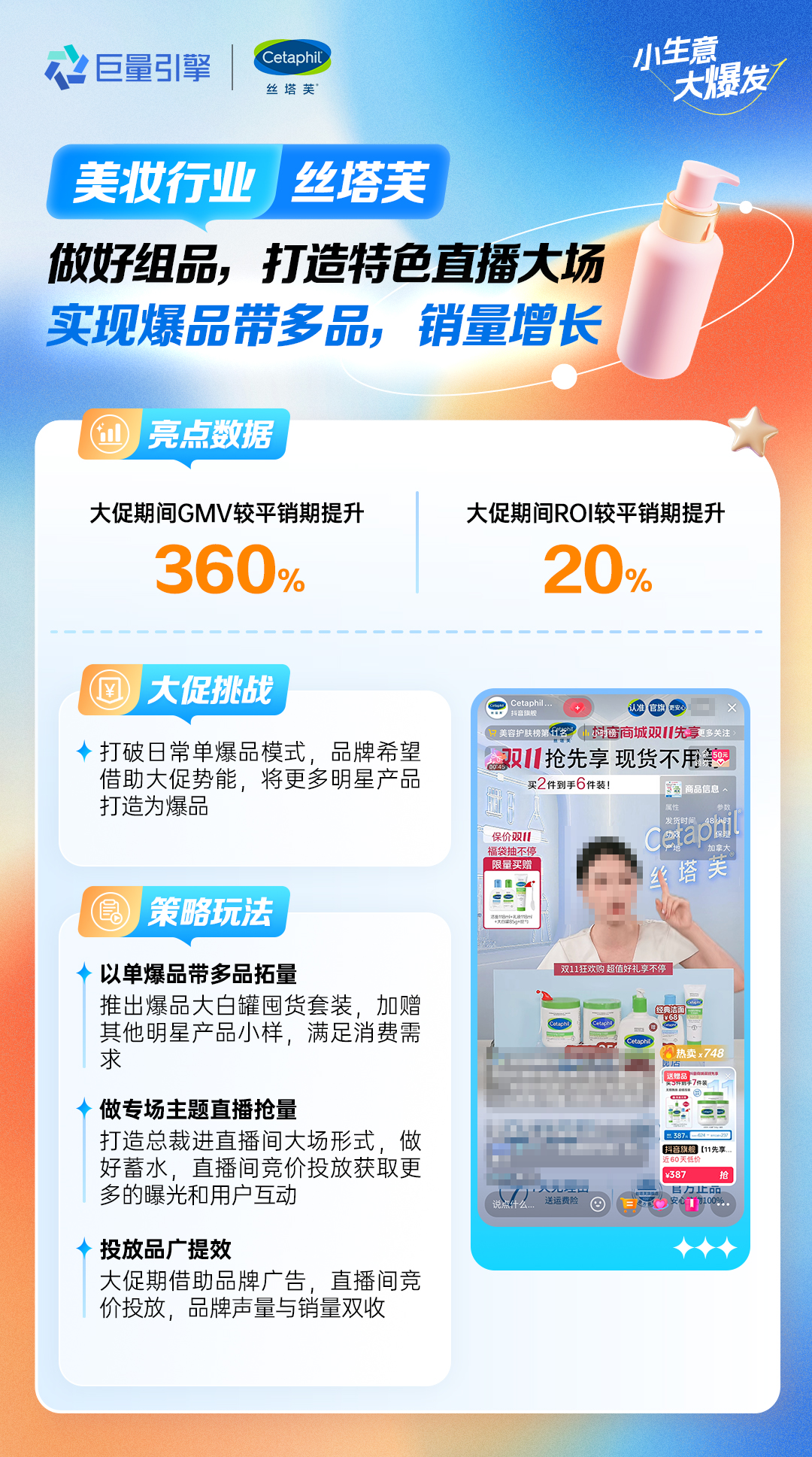 美妝行業(yè)商家絲塔芙 做好組品,打造特色直播大場(chǎng),實(shí)現(xiàn)爆品帶多品,銷量增長(zhǎng) “大白罐”是美妝商家絲塔芙的爆款單品,本次雙11大促,商家計(jì)劃發(fā)揮“大白罐”引流優(yōu)勢(shì),帶動(dòng)更多產(chǎn)品成為爆品。首先,商家優(yōu)化組貨策略,推出了“大白罐”囤貨套裝,并加贈(zèng)其他明星產(chǎn)品小樣,激發(fā)消費(fèi)者下單欲望;并以總裁進(jìn)駐直播間派送福利作為直播間爆點(diǎn),撬動(dòng)潛在消費(fèi)客群關(guān)注;在直播中投放品牌廣告與競(jìng)價(jià)廣告,獲得更多曝光與轉(zhuǎn)化。相較于平銷期,絲塔芙的GMV提升了360%。