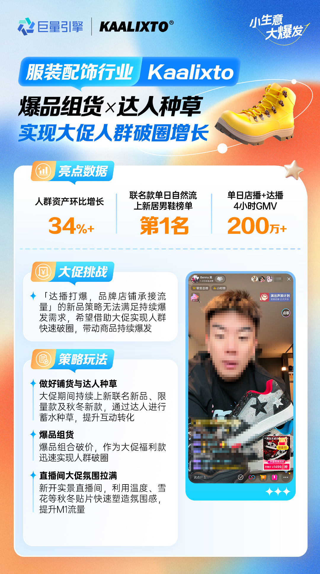 服飾商家Kaalixto希望借勢(shì)雙11大促勢(shì)能,實(shí)現(xiàn)人群快速破圈,帶動(dòng)商品高效轉(zhuǎn)化。在貨品方面,持續(xù)上新聯(lián)名新品、限量款和秋冬新款,借助達(dá)人種草蓄水,再選擇以爆品組貨破價(jià)作為大促福利款,迅速實(shí)現(xiàn)人群破圈;在內(nèi)容方面,通過新開實(shí)景直播間,利用符合秋冬場(chǎng)景貼片快速塑造氛圍感,提升內(nèi)容流量。雙十一期間,Kaalixto聯(lián)名款單日自然流量登頂男鞋第一,單日店播和達(dá)播4小時(shí)GMV突破200萬(wàn),人群資產(chǎn)環(huán)比增長(zhǎng)超過34%。