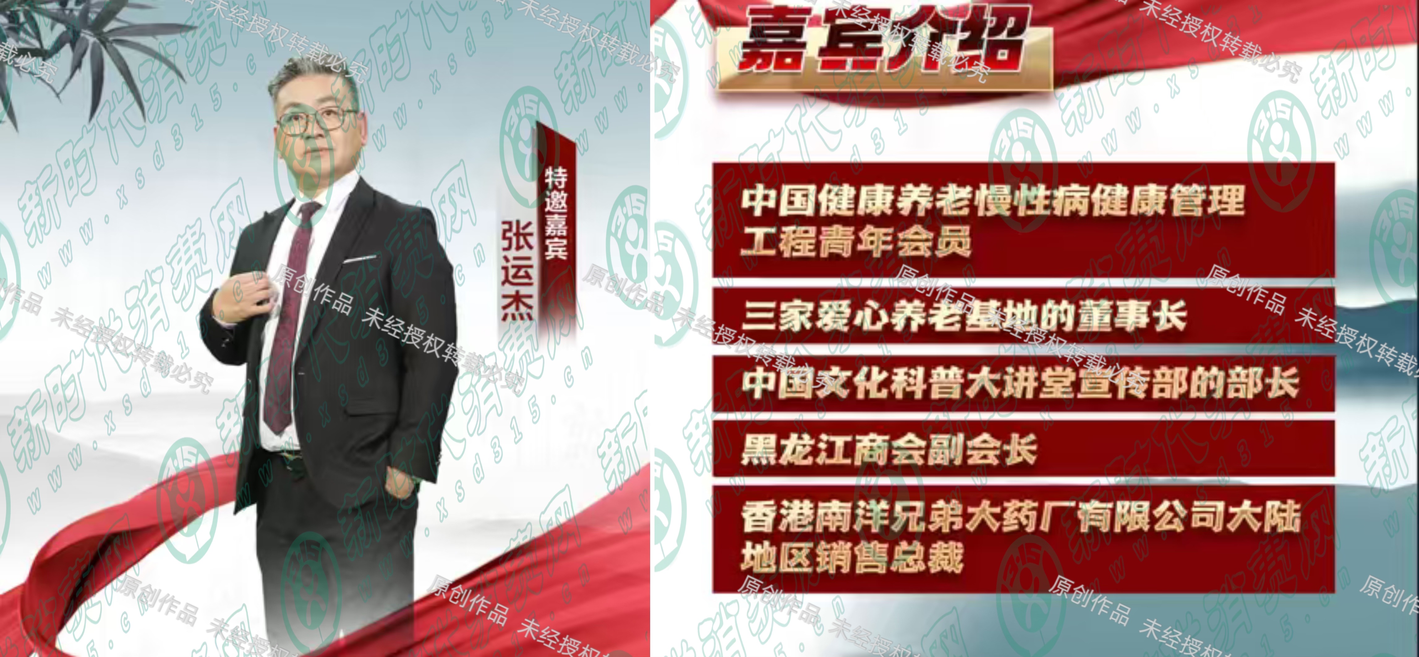 在每期視頻節(jié)目中,開頭都有一位自稱“張運杰”的主播出現(xiàn),視頻中標注其為中國健康養(yǎng)老慢性病健康管理工程青年會員、中國文化科普大講堂宣傳部部長等多項頭銜與身份,但在相關(guān)政務(wù)及企業(yè)信息平臺無法核實,其聲稱的三家愛心養(yǎng)老基地董事長、黑龍江商會副會長等身份亦無從考證,黑龍江商會的相關(guān)信息更是查無實據(jù)。